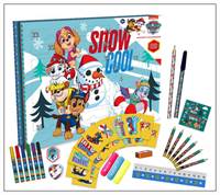Adventní kalendář s motivem Paw Patrol obsahuje: 6x pastelky, 6x fixy, 2x gumu, 2x aršík se samolepkami, 1x poznámkový bloček, 1x razítko, 1x HB tužku, 1x propisku, 1x ořezávátko, 3x mini zvýrazňovač.