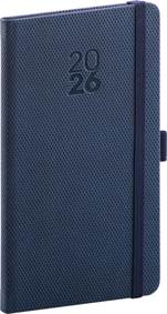 Kapesní diář Diamante 2026 v modré barvě. Povrch diáře má jemnou strukturu připomínající výbrus diamantu a je ideální pro všechny typy ražeb. Diář má zakulacené rohy, poutko na tužku a elastickou gumičku. Týdenní rozvrh s česko-slovenským kalendáriem a doplňkovou angličtinou, němčinou, maďarštinou a ruštinou. <br><br>• kalendárium od prosince 2025<br/> • roční plánovací kalendář 2026–2027<br/> • pracovní plánovací kalendář<br/> • svátky České a Slovenské republiky a mezinárodní svátky<br/> • rozšířený seznam českých jmen<br/> • místo pro osobní údaje<br/> • perforované růžky<br/> • prostor pro poznámky<br/>